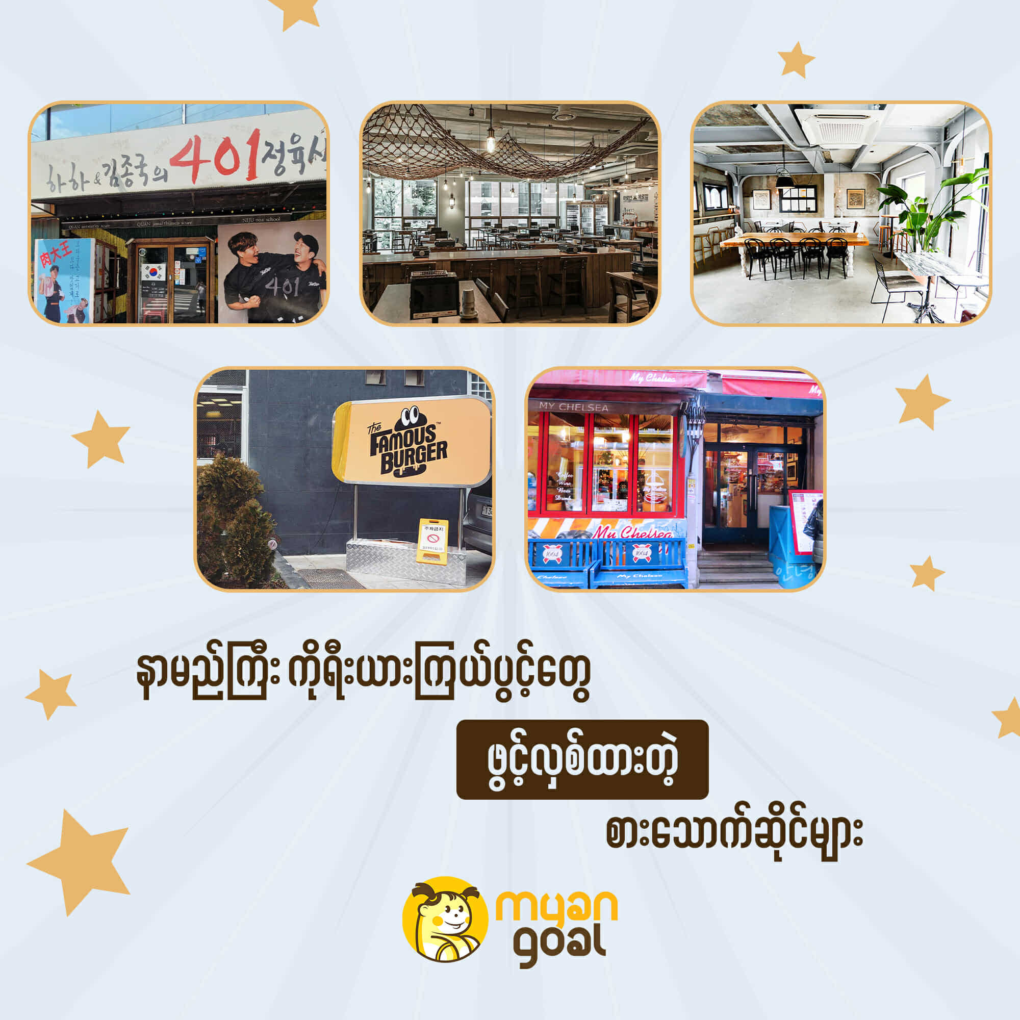 တောင်ကိုရီးယားမှာ နာမည်ကြီး အရသာရှိတဲ့ စားသောက်ဆိုင်တွေ အများကြီး ရှိပါတယ်။ ဒီထဲမှာ နာမည်ကြီး ကိုရီးယားကြယ်ပွင့်တွေ ဖွင့်လှစ်ထားတဲ့ ဆိုင်တွေလဲ ပါပါတယ်။ ဒီဆိုင်တွေဟာ နာမည်ကြီးတွေ ဖွင့်လှစ်ထားတာကြောင့် လူသိများရုံသာမက အစားအသောက်ကောင်းတာကြောင့်လဲ ကျော်ကြားပါတယ်။ ဒါကြောင့် ဒီနေ့မှာတော့ နာမည်ကြီး ကိုရီးယားကြယ်ပွင့်တွေ ဖွင့်လှစ်ထားတဲ့ စားသောက်ဆိုင်တွေကို ပြောပြလိုက်ပါတယ်။ ဒီထဲမှာ ကိုယ်ကြိုက်နှစ်သက်တဲ့ နာမည်ကြီးကြယ်ပွင့်တွေရဲ့ ဆိုင်တွေပါမလားဆိုတာ ကိုယ်တိုင်ဖတ်ကြည့်ကြည့်လိုက်ပါ။