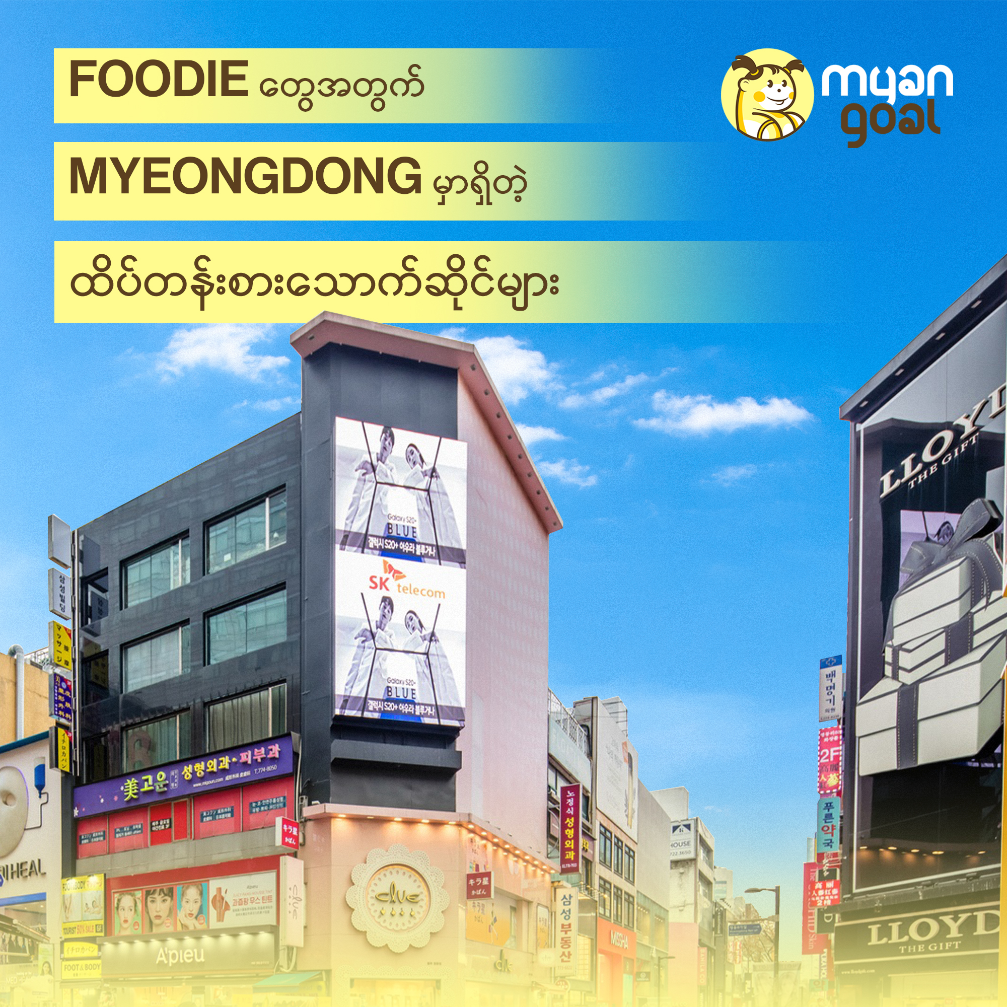 Myeongdong ဟာ ဆိုလ်းရဲ့ အဓိက ဈေးဝယ်လို့ကောင်းတဲ့နေရာတခုဖြစ်ပြီး Lacoste ၊ Polo Ralph Lauren ၊ H&M ၊ Zara ၊ Forever 21 ၊ Bulgari နှင့် Louis Vuitton စတဲ့ နိုင်ငံတကာမှ နာမည်ကြီး အမှတ်တံဆိပ်ဆိုင်တွေ အပြင် Nature Republic၊ Missha ၊ The Face Shop နှင့် Skin Food တို့ကဲ့သို့ ကိုရီးယားက နာမည်ကြီးအလှကုန် အမှတ်တံဆိပ်ဆိုင်များလဲ ရှိပါတယ်။ ။ Myeongdong အတွင်းမှာ Lotte Department Store ၊ Shinsegae Department Store ၊ Migliore ၊ M Plaza နှင့် Noon Square လိုဈေးဝယ်စင်တာကြီးများနှင့် ကုန်တိုက်ကြီးအများအပြားလဲ ရှိပါသေးတယ်။ ဒီနေရာကတော့ လူငယ်များနဲ့ ခရီးသွားများအတွက် အထူးရေပန်းစားသော နေရာဖြစ်ပါတယ်။ ဒီနေ့မှာတော့ Myeongdong မှာရှိတဲ့ ထိပ်တန်း စားသောက်ဆိုင်များကို အစားအသောက်ကြိုက်တဲ့ foodie လေးတွေအတွက် ပြောပြပေးလိုက်ပါတယ်။ 🔊📢