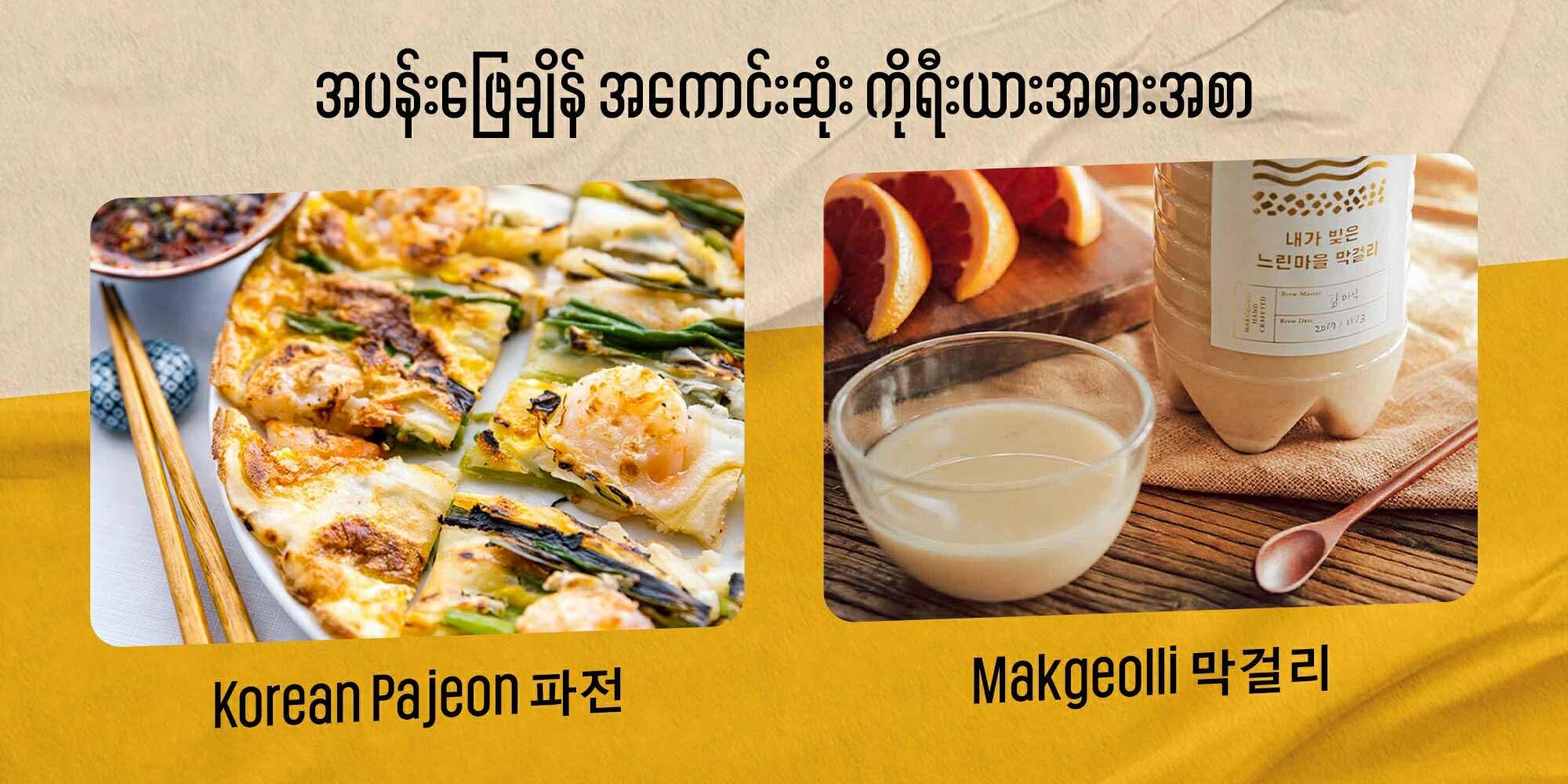ကြွပ်ကြွပ်ရှရှ Pajeon 파전 (ကြက်သွန်မြိတ်ပန်ကိတ်) နဲ့ အေးအေးလူလူ Makgeolli 막걸리 (ဆန်အရက်) တို့ဟာ အပန်းဖြေတဲ့အခါမှာ ကိုရီးယားရဲ့ အကောင်းဆုံး အစားအစာအတွဲအဖက်ပါပဲ။ ✨ ကိုရီးယားပုံစံနဲ့ အနားယူကြရအောင်။