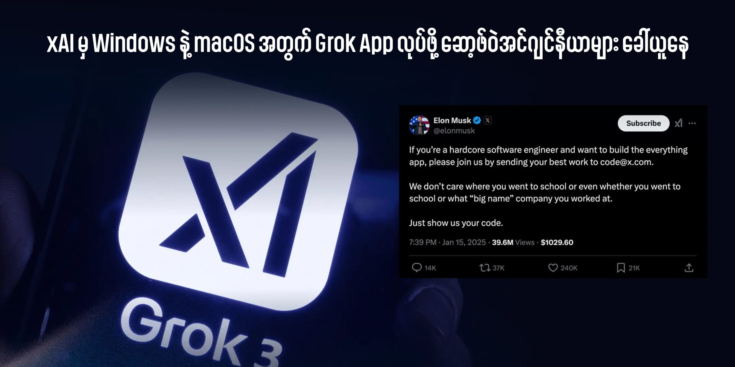Elon Musk ပိုင်ဆိုင်တဲ့ xAI ကုမ္ပဏီဟာ Windows နှင့် macOS အသုံးပြုသူများအတွက် သီးသန့် Grok App တစ်ခုလုပ်ဖို့ ဆော့ဖ်ဝဲအင်ဂျင်နီယာများကို ခေါ်ယူနေကြောင်း X ပလက်ဖောင်းပေါ်မှာ ကြေညာခဲ့ပါတယ်။ xAI ရဲ့ တွဲဖက်တည်ထောင်သူ Igor Babuschkin နဲဲ့ နည်းပညာဝန်ထမ်း Sulaiman Khan Ghori တို့က macOS အတွက် App ဖန်တီးဖို့ Swift နဲ့ AppKit တို့လို Software တွေကို ကျွမ်းကျင်စွာအသုံးပြုနိုင်တဲ့ အင်ဂျင်နီယာများကို ရှာဖွေနေကြောင်း X မှာ ဖော်ပြခဲ့ပါတယ်။