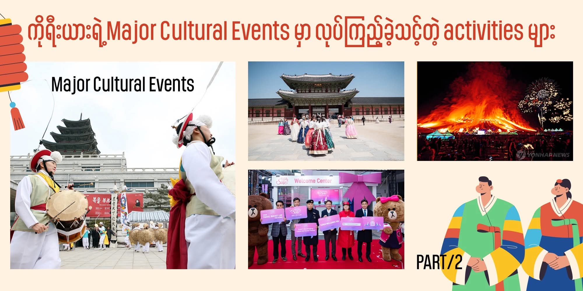 ကိုရီးယားနိုင်ငံဟာ ရိုးရာယဉ်ကျေးမှုနဲ့ ခေတ်သစ်ဖျော်ဖြေရေးတို့ကို ပေါင်းစပ်ထားတဲ့ စိတ်ဝင်စားစရာ ပွဲတော်များစွာကို ကျင်းပလေ့ရှိပါတယ်။ ရှေးဟောင်းအမွေအနှစ် ပွဲတော်တွေကနေ K-Pop ဖျော်ဖြေပွဲတွေအထိ တစ်နှစ်ပတ်လုံး စုံလင်စွာ တွေ့နိုင်ပါတယ်။ ကိုရီးယားကို ရောက်ရင်တော့ ယဉ်ကျေးမှုပွဲတော်တွေကို ဆင်နွှဲရင်း activities မျိုးစုံကိုလည်း လုပ်ကြည့်ခဲ့ဖို့ မမေ့ပါနဲ့။! ဒါကြောင့် ဒီနေ့မှာလည်း ကိုရီးယားရဲ့ အဓိက ယဉ်ကျေးမှုပွဲတော်တွေမှာ လုပ်ကြည့်ခဲ့သင့်တဲ့ activities တွေကို ထပ်ပြီးတော့ ပြောပြလိုက်ပါတယ်။